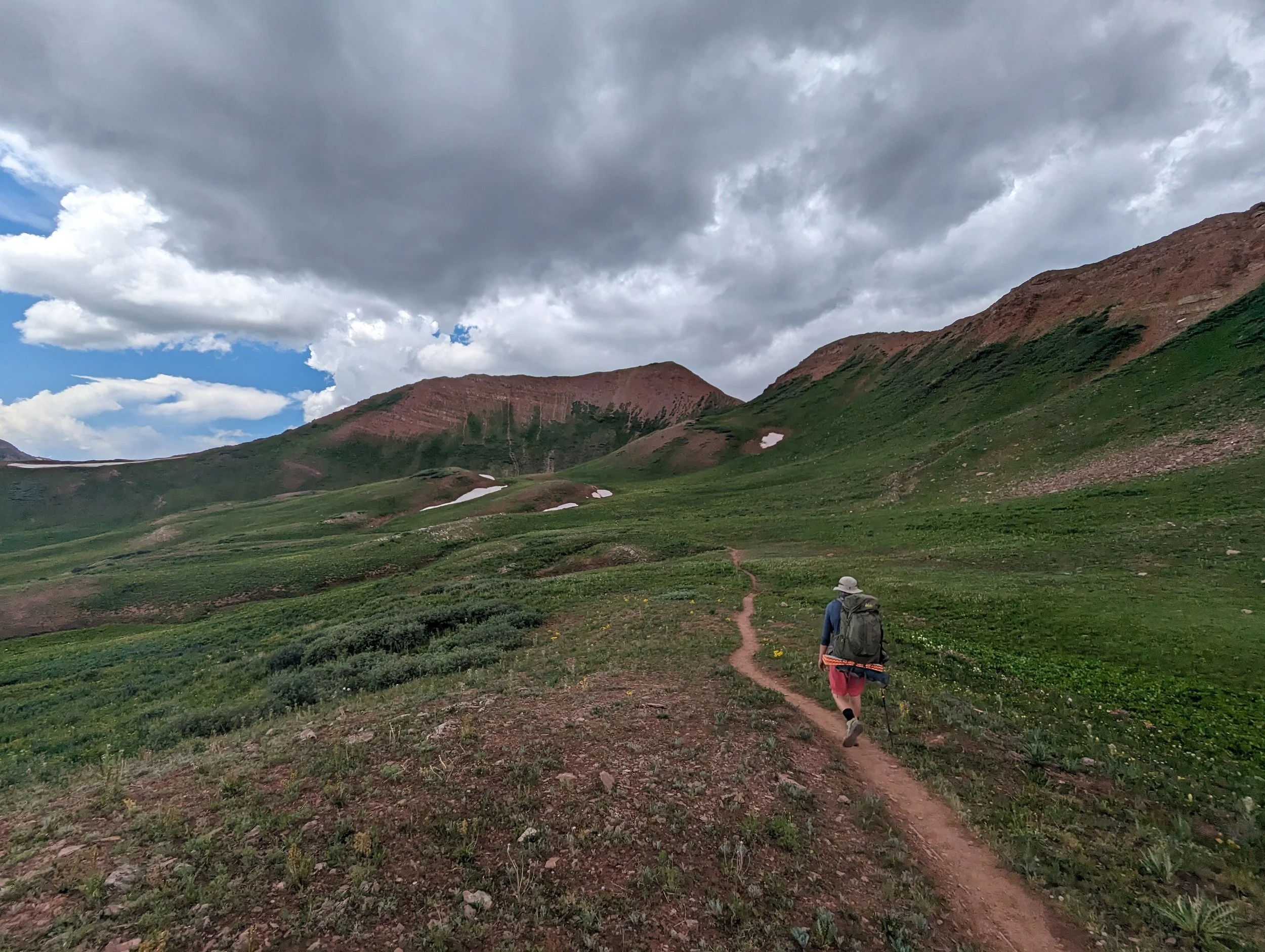 Behind us, Snowmass Mountain slowly rose into view. Dark clouds gathered overhead, rumbling their warning at us. Above, we could see specks of people standing atop our final pass. The weather was ominous, but we didn’t want to lose momentum. It started sprinkling. We kept going. Well above treeline now, the views were spectacular, but we were at the mercy of the weather.