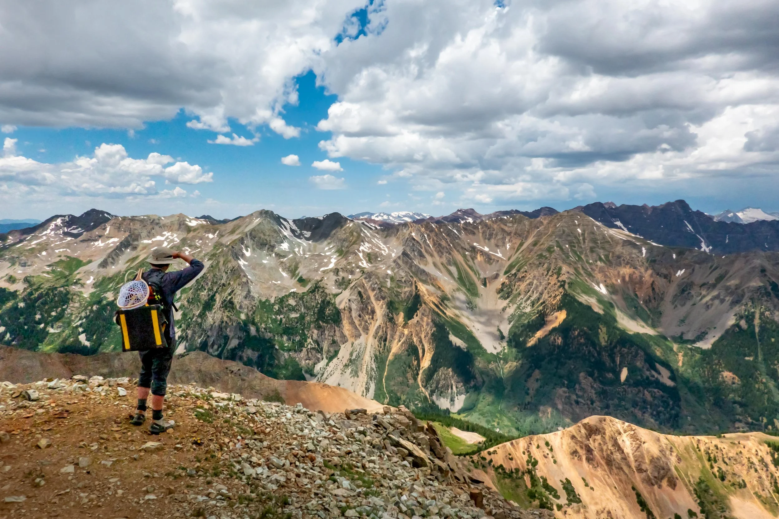 Not wanting to further tempt a lightning storm at a spot called Electric Pass, we eventually began our return journey. But first, we would go up. We quickly summited the adjacent 13,600 ft peak, a minute detour that prevented us from repeating our sketchy scree crossing. We met a hiker on his way down to the pass from the peak. Carter, still carrying his fishing gear on this high mountain ridge, despite the obvious lake lying miles behind us, wanted to make a crack to the hiker about looking for the lake. But the hiker beat him to the punch. “Not a lot of great fishing up here, I’m afraid,” he chuckled as we passed, causing us to giggle. Carter figured since he was up here anyways, he might as well look.