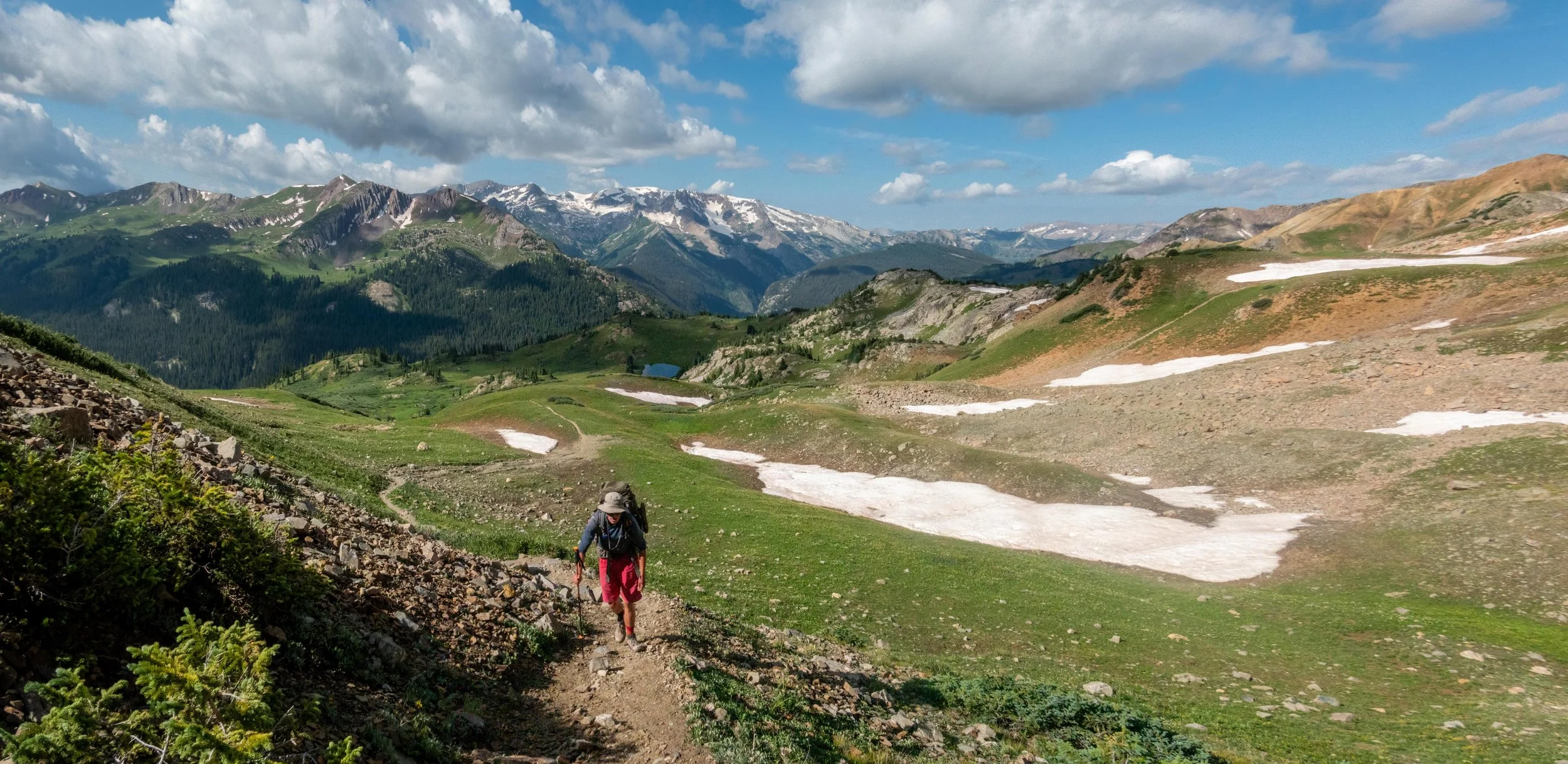 Pass 1 of 4 conquered, we set down the far side as a small crowd started forming on the summit. Our descent into the East Fork Zone was so scenic, with the Raggeds Wilderness ahead in the distance, the lush valley stretching before us, and the shifting clouds playing light across the entire scene. We would be camping in this zone tonight before climbing pass number two tomorrow, but we didn’t see any obvious campsites as we hiked. We knew we wanted to find a spot with easy access to a water source, but lingering snowfields were much less abundant on this side of the mountain. We kept our eyes peeled, enjoying the scenery along the way.