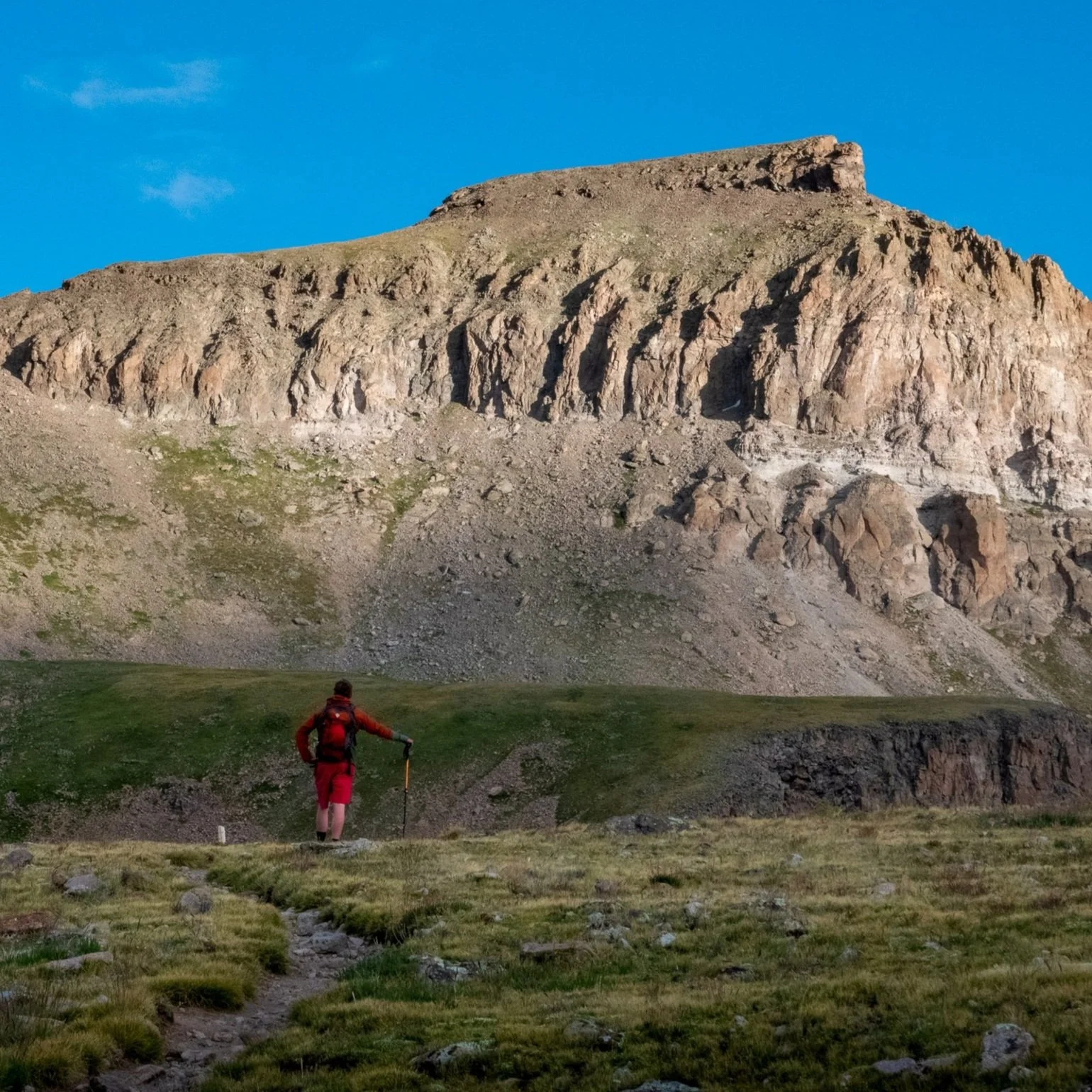 We plodded along the trail, slowly approaching Uncompahgre. We were coming from the backside, so we’d have to hike around the mountain before going up it. The sun was rising on the far side of the mountain, so we hiked in the shade. I continued to shiver, chilled by the sweat soaked into my jacket. Typically, I’m able to quicken my pace to warm my body, but it didn’t seem to be working. I yearned for the touch of the sun as we marched on.